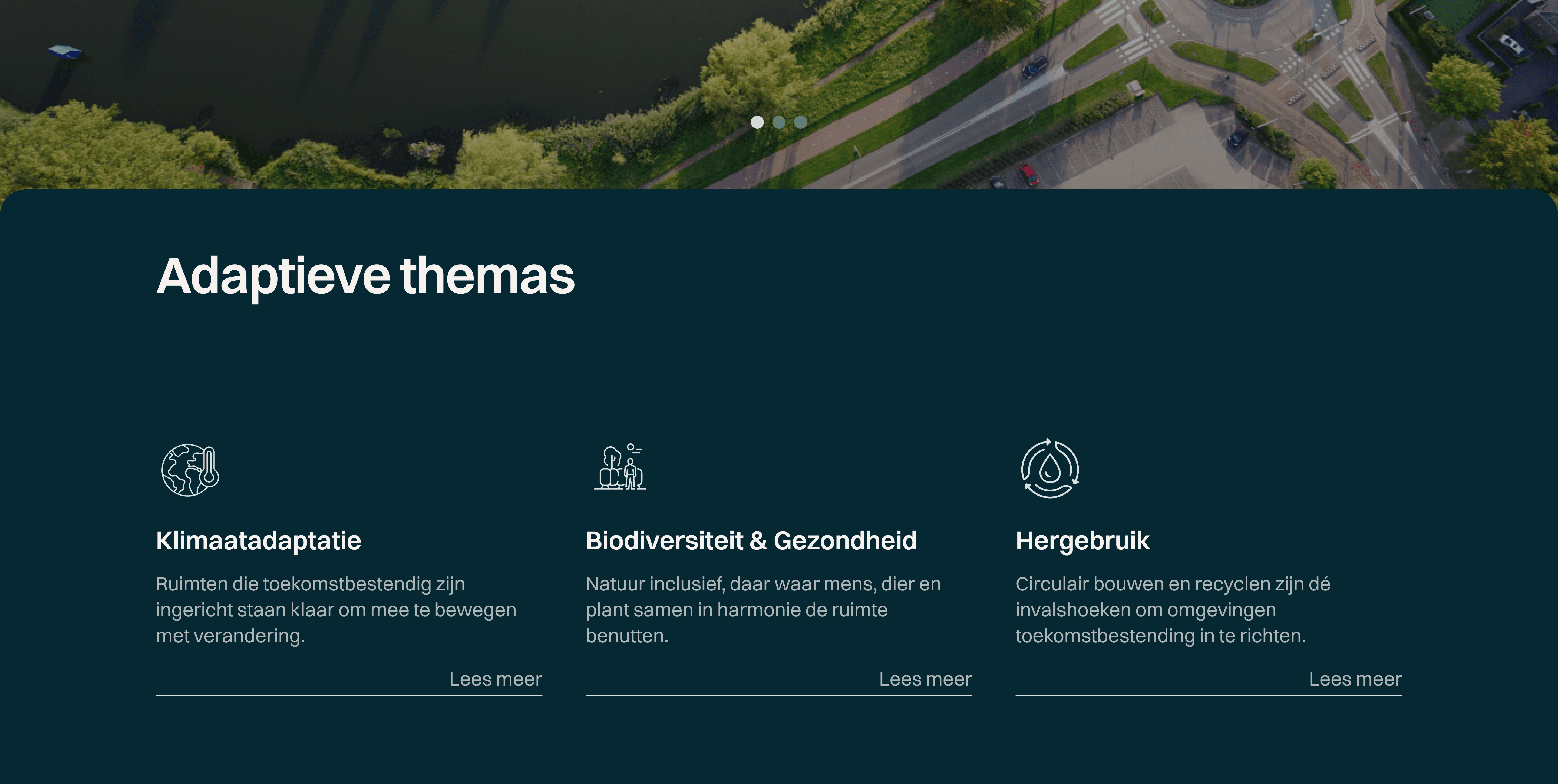 NL Adaptief is a knowledge platform by Buro Ontwerp & Omgeving, designed to inspire professionals and municipalities to build a future-proof Netherlands. The platform brings together projects, articles and themes around adaptive design from climate adaptation and biodiversity to energy, reuse and social cohesion.